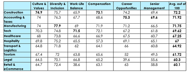 Using these rankings, TollFreeForwarding.com scored each industry on a scale of 1 to 100 for each category, as well as an overall average. The research found the construction industry to have the most satisfied employees of any industry, earning an overall score of 72.20 out of 100.